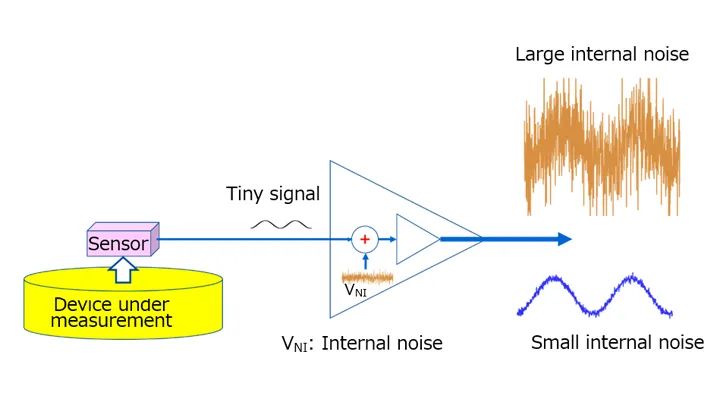 1/f噪声和白噪声均出现在运算放大器的输入端,并且都被定义为等效输入噪声电压。等效输入噪声被增益放大并出现在输出端。需特别注意低频噪声,因为它的电压取决于频率。为放大微小信号,会级联多个放大器以防止异常振荡。