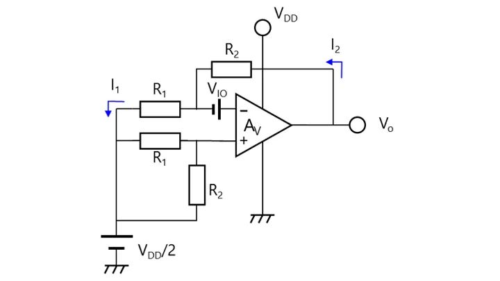 我们来看下输入补偿电压为VIO的运算放大器。如图3所示的输入补偿电压测试电路,可将该运算放大器视为理想的运算放大器,外部VIo电压源连接至VIN(-)。VIN(+)电压变为VDD/2。根据虚拟短路概念,VIN(-)电压也变为VDD/2。因此,R1与R2交叉处的电压变为VDD/2-VIO。在理想运算放大器情况下,I1=I2。,VIO=(VDD/2-VO)×R1/(R1+R2)。请注意,电阻器有一定的容限。如果超出系统的容限,则需修改电路结构,以减少输入补偿电压的影响或选用输入补偿电压较低的运算放大器。