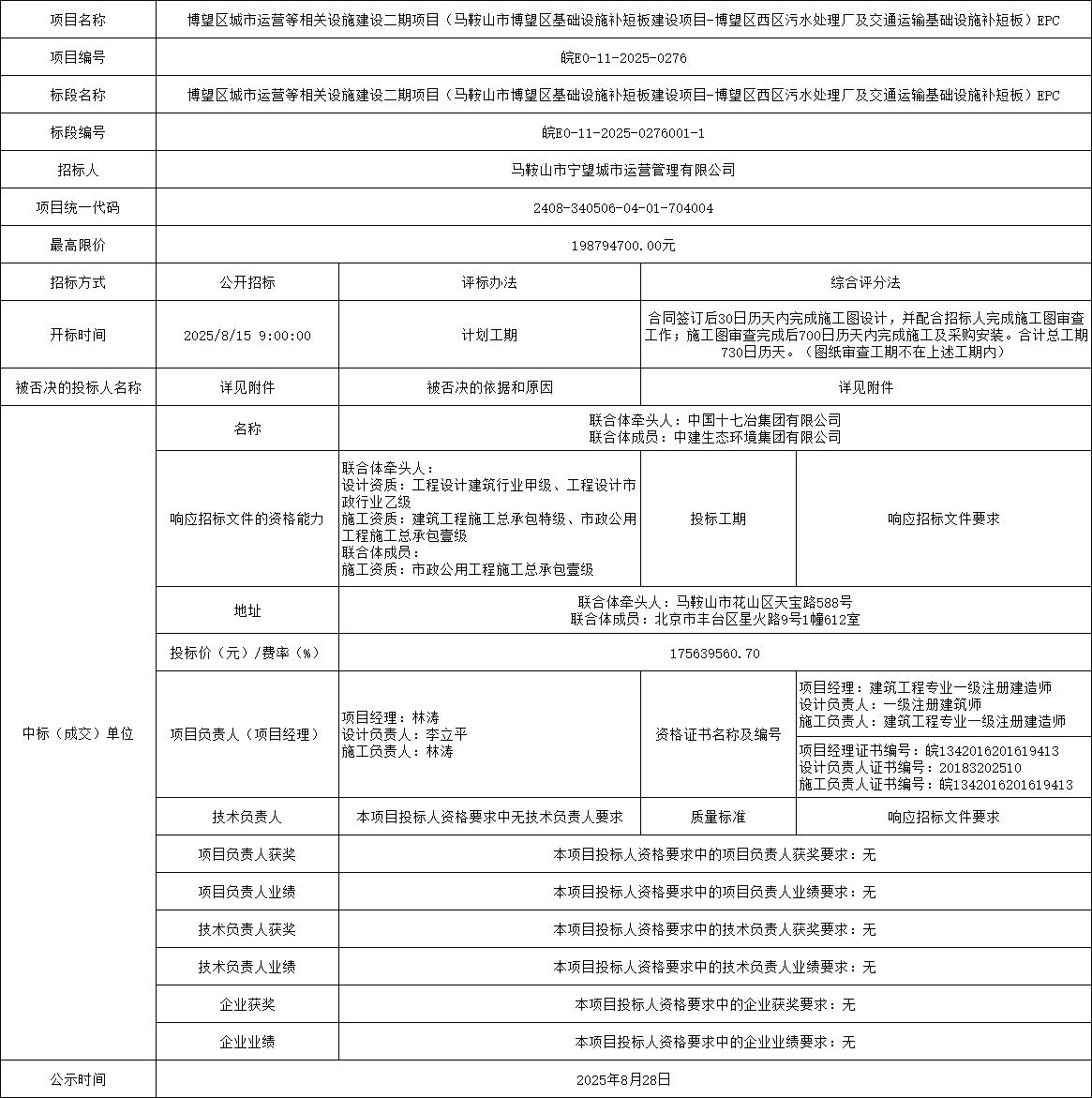 安徽马鞍山博望区城市运营等相关设施建设二期项目(马鞍山市博望区基础设施补短板建设项目-博望区西区污水处理厂及交通运输基础设施补短板)EPC中标结果公示。中国十七冶集团有限公司、中建生态环境集团有限公司联合体中标,中标价格175639560.70元。